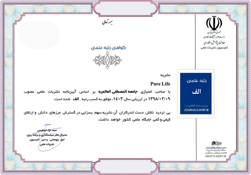 با افتخار و سرور به استحضار می رسانیم نشریه بین المللی دانشگاه مجازیالمصطفی (ص) با عنوان: Pure Life موفق به کسب «رتبه الف» از سوی وزارت علوم، تحقیقات و فناوری گردید.