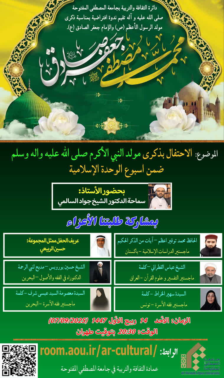 📌دائرة الثقافة والتربية بجامعة المصطفى المفتوحة صلى الله عليه و آله تقيم ندوة افتراضية بمناسبة ذكرى مولد الرسول الأعظم (ص) والإمام جعفر الصادق (ع)