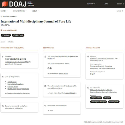 نمایه شدن نشریه علمی دانشگاه مجازی المصطفی با عنوان: "International Multidisciplinary Journal of Pure Life (IMJPL)" در پایگاه بین المللی DOAJ