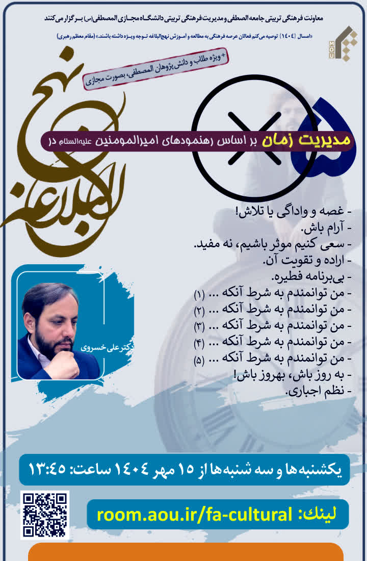 💠 دوره آموزشی تربیتی با موضوع: مدیریت زمان بر اساس رهنمودهای حضرت امیرالمومنین علی علیه‌السلام در نهج‌البلاغه
