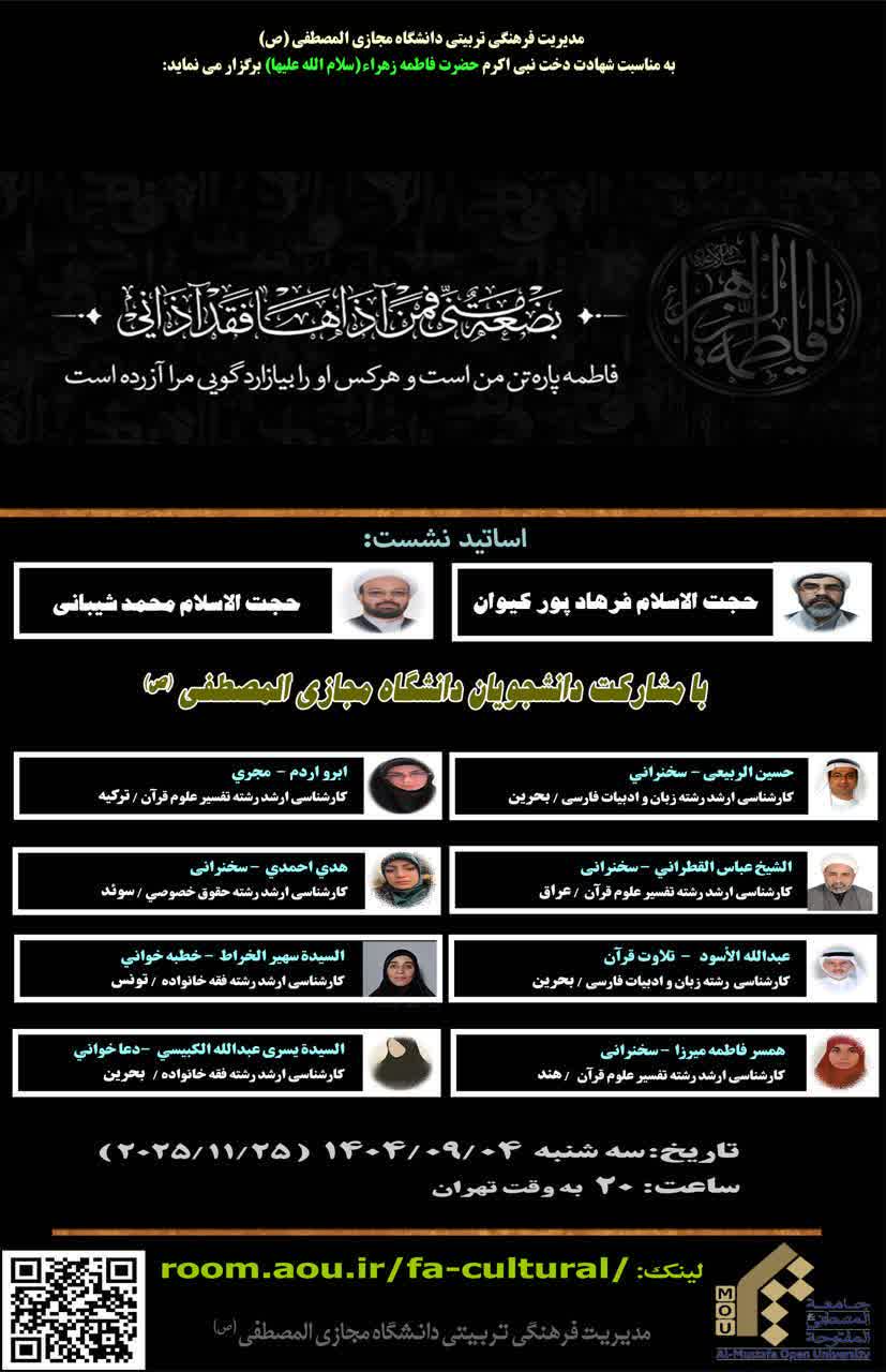 📌مدیریت فرهنگی تربیتی دانشگاه مجازی المصطفی (ص) به مناسبت شهادت دخت نبی اکرم، حضرت فاطمه زهراء(سلام الله علیها) برگزار می نمايد: