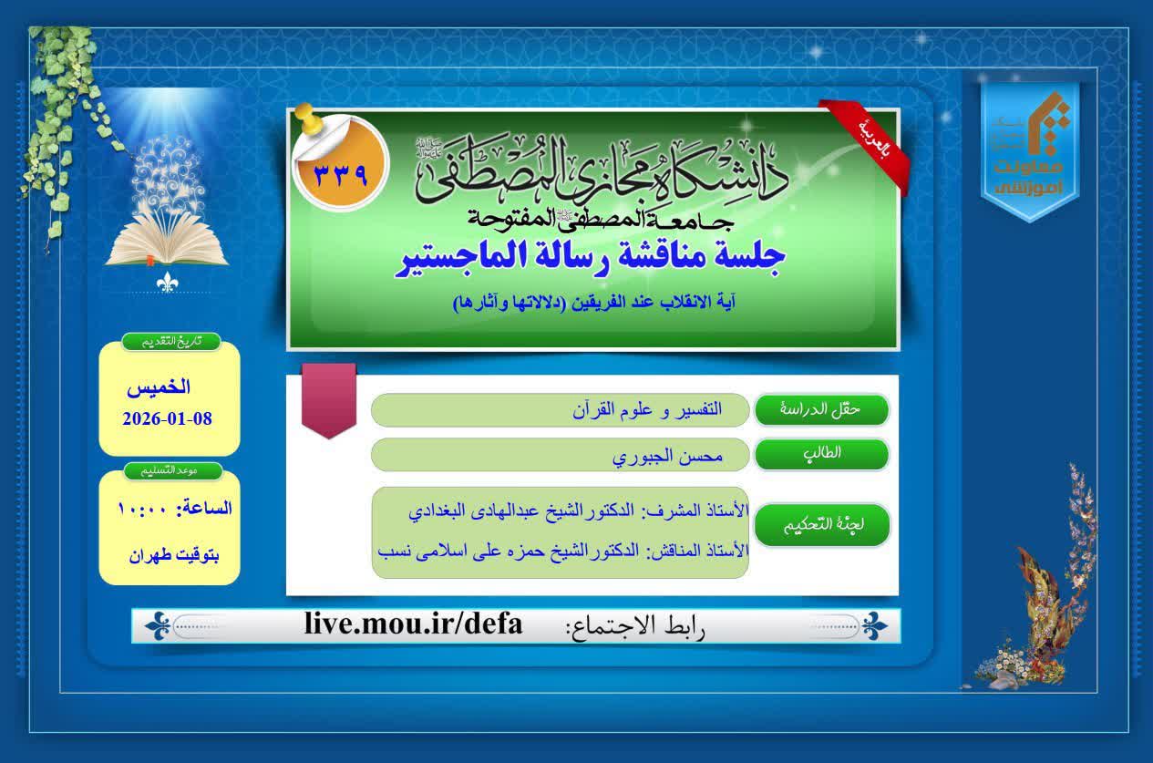 جلسه دفاع از پایان‌نامه کارشناسی ارشد با عنوان: آية الانقلاب عند الفريقين (دلالاتها وآثارها)